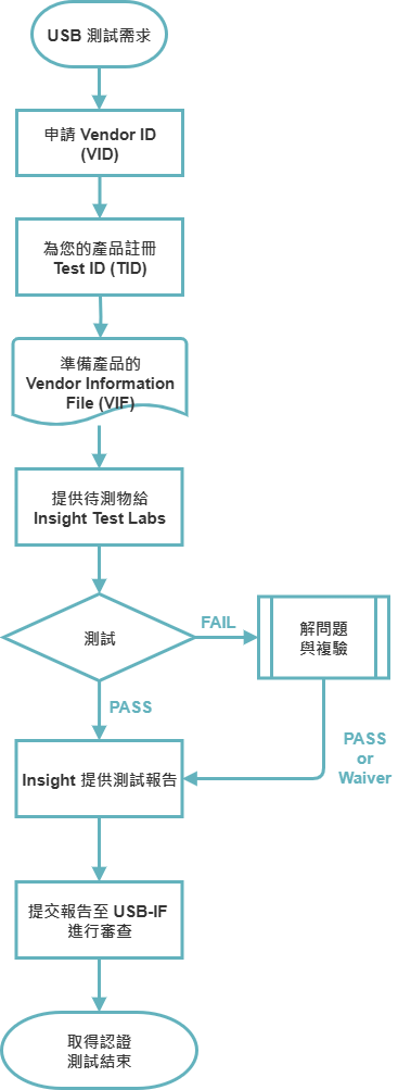 要獲得 USB 認證,您或品牌擁有者必須擁有 USB Vendor ID(VID)。取得 USB-IF 官方網站的帳號憑證後,您即可為產品註冊 Test ID(TID)。TID 是進行任何認證測試的必要條件。VID 申請請參考:https://www.usb.org/getting-vendor-id